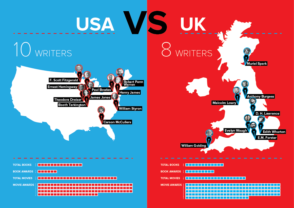 In een dataset met de 100 meest invloedrijke boeken ooit, bleken vooral schrijvers uit Amerika en het Verenigd Koninkrijk te staan. In een visualisatie heb ik deze twee landen (weer) tegenover elkaar gezet en gevisualiseerd welk land de meeste prijzen heeft gewonnen dankzij deze boeken.