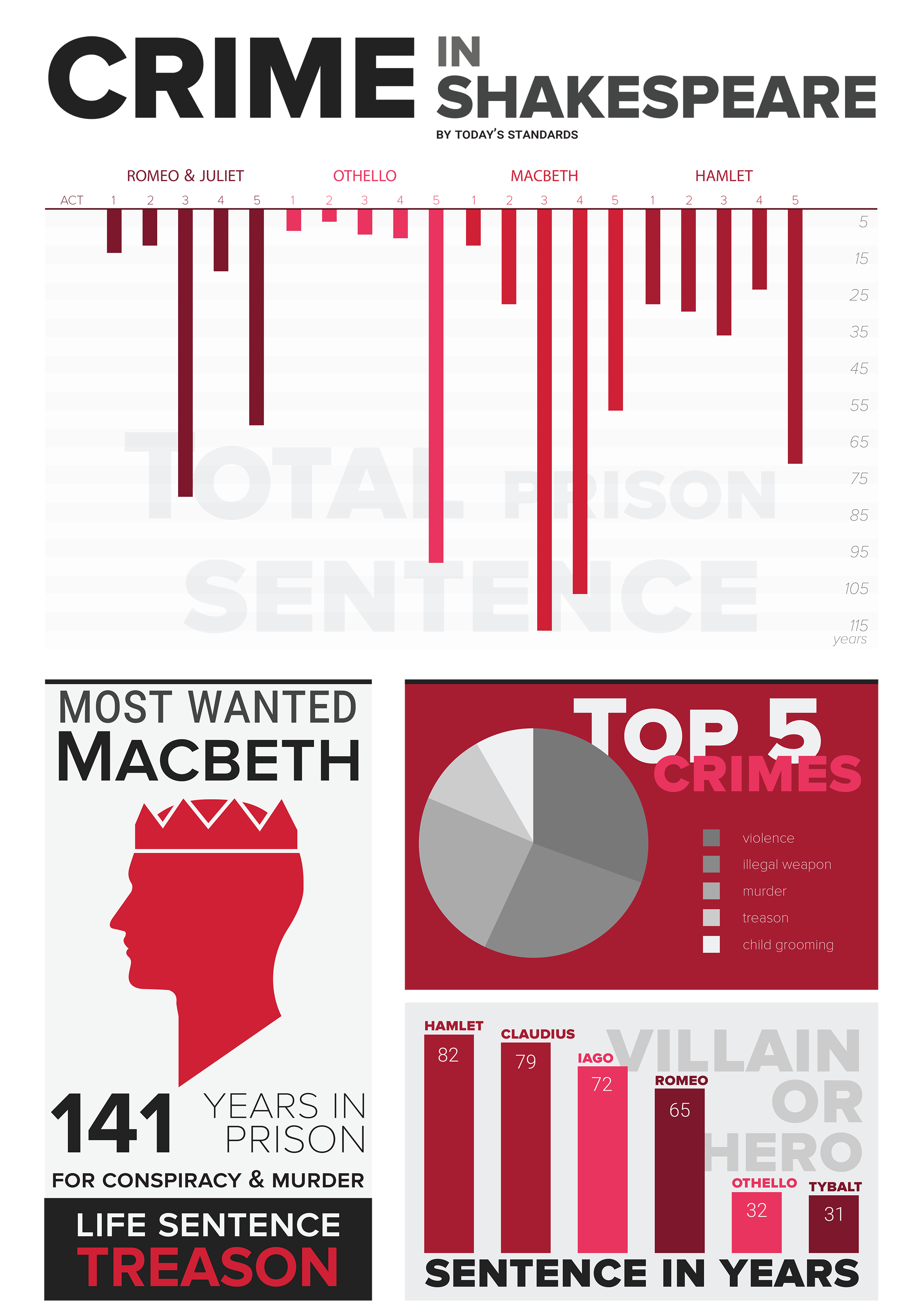 Voor een ander project heb ik de bekenste werken van Shakespeare doorzocht en naar deze tijd getrokken. Gebeurtenissen die in de tijd van Shakespeare normaal waren zouden tegenwoordig als misdadig gezien kunnen worden. Ik heb gekeken hoeveel gevangisstraf er op deze misdaden zou staan en dit bij elkaar opgeteld. Hieruit bleek dat de "held" van het stuk vaak een grotere misdadiger is dan de "slechterik".